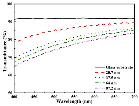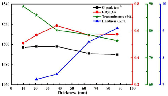 The thickness of the SiOx:DLC films was controlled from 9.8 to 87.2 nm. Figure 8 and Figure 9 display the properties and transmittance spectra of the SiOx:DLC films of various thicknesses, respectively. The transmittance decreased as the thickness of SiOx:DLC films increased. Figure 8 reveals that the wavenumber of the G peak was between 1490 and 1498 cm−1, and the I(D)/I(G) ratio was between 0.5% and 0.6%. The structure of the SiOx:DLC film was independent of thickness. The hardness decreased and the transmittance increased as the thickness decreased. When the thickness was only 37.5 nm, the average transmittance was 80.3% and the hardness was 7.4 GPa, which was 23.3% higher than that of B270 substrate. When the thickness of the SiOx:DLC films on the B270 substrate was 64 nm, the hardness was 8.6 GPa, which was 43.3% higher than that of B270 substrate, and the transmittance in the visible region was 78.6%.