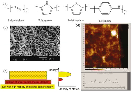 - Holland, E.R.; Pomfret, S.J.; Adams, P.N.; Abell, L.; Monkman, A.P. Doping dependent transport properties of polyaniline-CSA films. Synth. Met. 1997, 84, 777–778. [Google Scholar] [CrossRef]