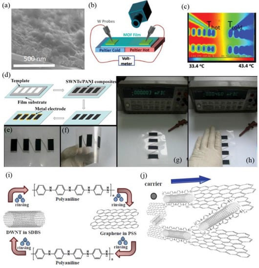 - Erickson, K.J.; Leonard, F.; Stavila, V.; Foster, M.E.; Spataru, C.D.; Jones, R.E.; Foley, B.M.; Hopkins, P.E.; Allendorf, M.D.; Talin, A.A. Thin film thermoelectric metal-organic framework with high Seebeck coefficient and low thermal conductivity. Adv. Mater. 2015, 27, 3453–3459. [Google Scholar] [CrossRef] [PubMed]