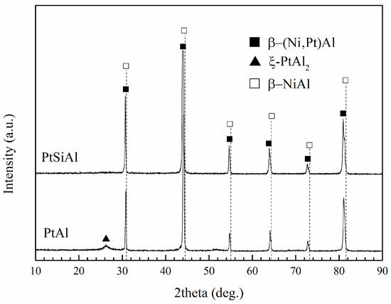 Figure 1 shows the X-ray diffraction patterns of the PtAl and PtSiAl coatings. It can be seen that the main phase of the PtAl coating is the β-(Ni, Pt)Al phase with a minor diffraction peak as the ξ-PtAl2 phase emerged. As for the Si doped Pt modified aluminide coating, only the β-(Ni, Pt)Al phase is detected, indicating that the addition of Si into the Pt modified aluminide coating could hinder the formation of the PtAl2 phase during the silico-aluminizing process. It is worth noting that the diffraction peaks of the β-(Ni, Pt)Al phase in the two coatings shift to lower angles compared with those of the β-NiAl phase (PDF 44-1188, a = b = c = 2.888 Å). This is due to the fact that the radius atom of the Pt element is larger than that of the Ni element and it enlarged the lattice constant of the β-NiAl phase when Pt atoms replaced Ni sites in the NiAl crystal lattice [20]. The lattice constant of β-(Ni, Pt)Al phase increases to 2.904 Å, calculated by Jade software (6.0).