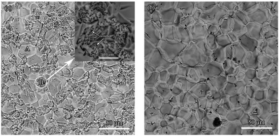The surface morphologies of the PtAl and PtSiAl coatings are presented in Figure 2. As can be seen in Figure 2a, the surface of the PtAl coating displays two distinct structures (area A and area B). Area A is dense and smooth, while in area B, there are many black dots, which are demonstrated to be holes in a higher magnification image. In Figure 2b, the surface of the PtSiAl coating is dense with some ridges between the particles. The number of holes in the PtSiAl coating is much less than that in the PtAl coating, which reveals that the addition of Si into the Pt modified aluminide coating could diminish holes on the coating surface and make the coating denser.