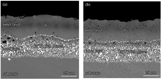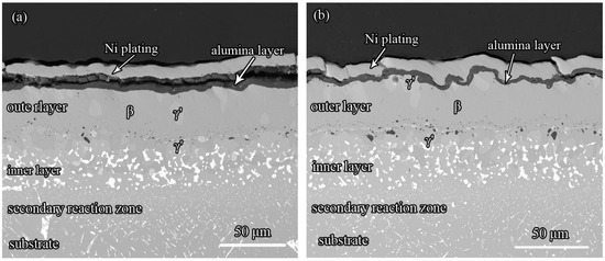 As shown in Figure 8, the alumina layer on the surface of the PtAl and PtSiAl coatings becomes thicker than that on the coatings oxidized for 2 h (in Figure 6), since the alumina layer grows gradually as the oxidation proceeds. It is obvious that the alumina layer formed on the PtAl coating is thicker than that formed on the PtSiAl coating. Amounts of β-(Ni, Pt)Al phase in the outer layer are transformed into the γ’-Ni3Al phase to perform the exclusive oxidation of Al. The relative area fractions of the γ’-Ni3Al phase in the outer layer of the PtAl and PtSiAl coating are 12.9% and 11.7%, respectively, indicating that more β-(Ni, Pt)Al phase has been consumed in the PtAl coating. As has been reported, compared with the outward diffusion of Al element to form the protective alumina scale, the mutual diffusion between the coating and substrate plays an even more important role in the degeneration of the coatings at the temperature of 1100 °C [18]. Since the elements like Ni and W in the substrate diffuse outward into the coating and the beneficial element Al diffuses into the substrate under the chemical composition gradient, the amounts of β phase are changed into the γ’ phase at the interface of the outer layer and inner layer. Due to the different solutions of the refractory elements in β and γ’ phases, the Cr(W) rich phases dissolve gradually in the inner layer. At the same time, the Cr(W) rich phases aggregate together and grow into larger particle sizes than before oxidation, which has been observed in our previous papers [18,22]. In addition, due to the mutual diffusion between the substrate and coating, there is some grey granular phase rich in Cr and bright needle-like phase rich in Cr and W formed in the substrate beneath the inner layer, which is called the secondary reaction zone. The grey granular Cr rich phase and needle-like Cr/W rich phase have been demonstrated to be the M23C6 and µ phase, respectively, by Liu et al. [18]. The µ phase is detrimental to the mechanical properties of the alloy, since it induces cracks in the substrate.