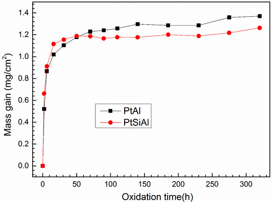 Figure 4 shows the kinetic curves of the PtAl and PtSiAl coatings after isothermal oxidation at 1100 °C for 320 h. At the initial 30 h, the mass gain of the two coatings increases dramatically, since rapid oxidation of the coatings happens once the samples are exposed to the high temperature environment. The mass gain of the PtAl coating is lower than that of the PtSiAl coating at this stage. After that, the oxidation rate of the two coatings decreases dramatically and the mass gain reaches a stable stage, as a continuous and dense alumina layer is formed on the coating surface which could delay the inward diffusion of the oxidative elements and protect the substrate from further oxidation. The maximum mass gains of the PtAl and PtSiAl coatings are about 1.37 mg/cm2 and 1.26 mg/cm2, respectively, demonstrating that the PtSiAl coating is more mildly oxidized than the PtAl coating when the adherent alumina scale is formed on the surface at 1100 °C.