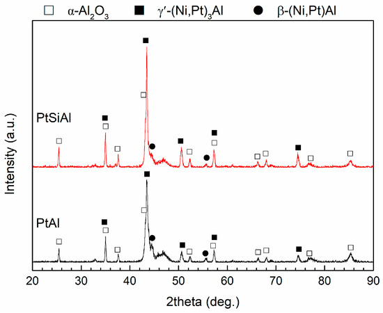 The X-ray patterns of the PtAl and PtSiAl coatings after isothermal oxidation at 1100 °C for 320 h are presented in Figure 5. As the oxidation proceeds to 320 h, the main phase of the two coatings transits from the β-(Ni, Pt)Al to the γ’-Ni3Al phase due to the large depletion of the beneficial element Al. The Al2O3 phase is detected and no diffraction peaks of other oxides emerged, because both of the two coatings contain a high content of Al in the outer layer and the Gibbs free energy of Al2O3 is much lower than that of other oxides like NiO and Cr2O3, resulting in the preferential oxidation of Al after an instant oxidation stage. Note that the PtAl2 phase diminishes in the PtAl coating since the PtAl2 phase is metastable and it would transit to the β-(Ni, Pt)Al phase at high temperature [20,21].
