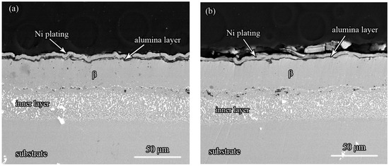 The cross-sectional morphologies of the PtAl and PtSiAl coatings are shown in Figure 3. Both of the PtAl and PtSiAl coatings bear a two-layer structure. The outer layer is primarily composed of the β-(Ni, Pt)Al phase. Since the diffraction peaks of the PtAl2 phase are very weakly detected by XRD, it is not distinct in the outer layer of the PtAl coating. The inner layer is the diffusion layer which consists of the β-(Ni, Pt)Al phase and some Cr(W) bright white phases, which form due to the phase transformation from the γ-Ni into the β-(Ni, Pt)Al phase and the refractory elements, e.g., Cr, W, etc. possess a higher solubility in the γ-Ni than those in the β-(Ni, Pt)Al phase. The black dots at the interface between the inner layer and outer layer are alumina particles left during the sand blasting process, which reveals that this interface is the original substrate surface and both of the two coatings form primarily through the outward diffusion of the Ni element. The average compositions in the outer layers of the PtAl and PtSiAl coatings are 46.2Al-1.9Cr-4.5Co-43.5Ni-3.9Pt (at.%) and 43.6Al-2.3Cr-4.1Co-45.6Ni-3.9Pt-0.7Si (at.%), respectively. It can be seen that the Al content in the PtSiAl coating is lower than that in the PtAl coating, while the Ni content is higher in the PtSiAl coating. The thicknesses of the PtAl and PtSiAl coatings are about 54 µm and 55 µm, respectively.