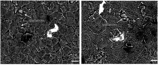 The surface and cross-sectional morphologies of the PtAl and PtSiAl coatings after oxidation at 1100 °C for 320 h are presented in Figure 7 and Figure 8, respectively. As can be seen in Figure 7, the surface of the two coatings is uneven. Moreover, spallation as well as cracking occur on the surface. The average chemical compositions of area A (black grey zone) on the PtAl and PtSiAl coatings in Figure 7a,b are 50.2O-46.4Al-1.6Ni-1.9W (at.%) and 57.7O-39.9Al-1.2Ni-1.2W (at.%), respectively, indicating that the surface of the two coatings is mainly made up of the α-Al2O3 phase, which is consistent with the XRD patterns shown in Figure 5. As for area B (bright white zone) of the two coatings, the average compositions are 19.3O-18.2Al-3.0Cr-5.3Co-48.7Ni-3.0W-2.4Pt-0.2Hf (at.%) and 12.4O-22.5Al-4.9Si-3.0Cr-4.1Co-40.6Ni-2.5Pt-0.1Hf (at.%), respectively. The Ni content in the white space is high because the spallation of the alumina layer leads to the exposure of the coating underneath. During the whole oxidation process, the alumina layer grows gradually, resulting in the generation of large growth stress, and the phase transition from θ/γ-Al2O3 to stable α-Al2O3 also induces internal stress in the alumina layer. Moreover, thermal stress is generated during the heating and cooling process. When the total internal stress is too high, the alumina scale first cracks and then peels off from the surface. The crack and spallation of the alumina layer could provide diffusion paths for the oxidative elements and speed up the degeneration of the coatings. When the Al content in the coating is high enough to sustain the exclusive oxidation of α-Al2O3, a new alumina layer is formed in the spallation area once the coating is exposed to the oxidative environment again. While, if the Al content is not high enough to sustain the selective oxidation of α-Al2O3, other oxides are formed. The mixed oxides are porous and not protective, and on the contrary, accelerate the oxidation of the substrate, meaning that the coating loses efficacy. As can be seen in Figure 5, no other oxides are detected by XRD, and a NiAl phase remains in both of the PtAl and PtSiAl coatings, demonstrating that the two coatings are still protective.