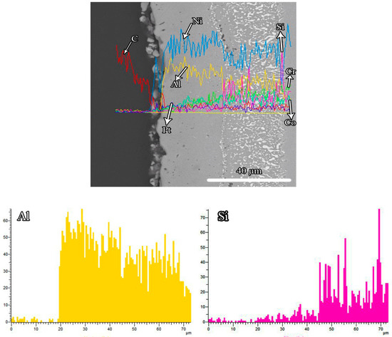 To analysis the Si effect on the microstructure of the PtSiAl coating, the element distributions of the coating from the surface to substrate are detected by SEM, as shown in Figure 9. The purple line represents the Si content in the coating. It can be seen that the Si content in the outer layer is lower than that in the inner layer. As mentioned above, the average Si content in the outer layer is about 0.7 at.%, which is much lower than its solubility in NiAl phase (2–4 at.%) [23], revealing that Si is dissolved in the (Ni, Pt)Al phase, which is consistent with the XRD pattern (Figure 1) where no silicide is detected. The dissolution of Si is beneficial for retarding the formation of the metastable phase PtAl2, which might be attributed to the fact that Si has a very low diffusion rate in the PtAl2 phase [17] and the deposition of Si might hinder the nucleation of the PtAl2 phase. In addition, there are less voids formed on the surface of the Si doped Pt modified aluminide coating than the Pt modified aluminide coating. The generation of voids is mainly resultant from the unequal diffusion fluxes of the Ni and Al elements during the silico-aluminizing process. The addition of Si into the coating might increase the outward diffusion of Ni since the Ni content in the outer layer of the PtSiAl coating is a little higher than that in the PtAl coating and Si could occupy the vacancies in the coating, resulting in the decrease of voids. The Si content in the inter diffusion zone fluctuates strongly, which indicates that Si distributes unevenly in this zone. It is reported that Si has a high affinity with the refractory elements, especially the Cr element, forming silicide in the substrate [1,17]. In the inner layer, the contents of the Cr and W elements are high, which could promote the precipitation of silicide. It is worth noting that the Si content is much lower than the Al content in the PtSiAl coating, since the equilibrium vapor pressure of AlF which is responsible for depositing Al is much higher than that of SiFy used to deposit Si in the chamber furnace at high temperature, when the fluoride is used as an activator [24]. Additionally, the deposition rate of the element is primarily dependent upon the quantity of the active halide. Thus, more Al element is deposited in the PtSiAl coating during the deposition process.