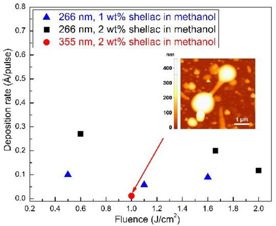 - Sellinger, A.; Leveugle, E.; Fitz-Gerald, J.-M.; Zhigilei, L.V. Generation of surface features in films deposited by matrix-assisted pulsed laser evaporation: The effects of the stress confinement and droplet landing velocity. Appl. Phys. A 2008, 92, 821–829. [Google Scholar] [CrossRef]