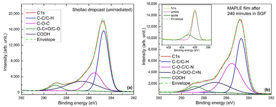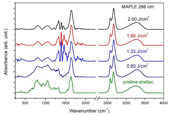 - Bercea, A.; Mitu, B.; Matei, A.; Marascu, V.; Brajnicov, S. Esterification process induced by UV irradiation of shellac thin films deposited by matrix assisted pulsed laser evaporation. Unpublished work. 2018. [Google Scholar]