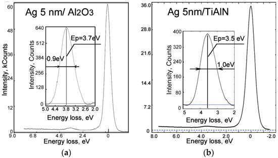 Figure 1 demonstrates electron energy loss spectroscopy (EELS) acquired from 5 nm thick Ag layers in MIM multilayer coatings with Al2O3 (Figure 1a) and TiAlN (Figure 1b). Inserts on these figures depict magnified surface plasmon peaks. It is observed that peak energies and half-widths (FWHM) of plasmon losses lines are different for these coatings. The Ag layer thickness in these MIM planar composites was the same.