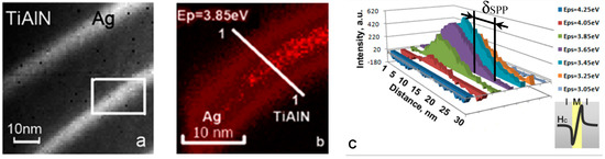 Back scattered image of angle lap of 10/20 Ag/TiAlN coating (a); plasmon losses mapping (ΔE = 3.85 eV) (b); distribution of plasmon intensities across line 1-1 in dependence on plasmon energy ωp (c), δSPP—depth of plasmon-polariton transboundary penetration.