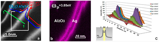 Back scattered image of angle lap of 5/24 Ag/Al2O3 coating (a); plasmon losses mapping (ΔE = 3.85 eV) (b); distribution of plasmon intensities across line 1-1 in dependence on plasmon energy ωp (c).