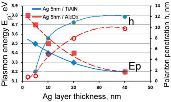 The plasmon energies are more prominent in thinner nanolayers due to electronic structure transformations. Plasmons in thin layer of Ag with both s and d-bands crossing the Fermi level are typically strongly damped by the presence of interband transitions. According to [17], Ag 5s electrons DOS growth is a common reason for increasing plasmon energy with metal nanolayer thinning. The increased binding energy of the plasmon with ion core (localised 5s electrons) provides more intense excitation energy as we observed with a damping Ag layer thickness in the nanometer range. Such growth of the surface plasmon energy at nanostructuring was demonstrated in [24,25] for silver clusters. This definite shift of plasmon peak to higher frequency is also called “blue shift”. The dielectric environment of the silver layers has a significant effect on the depth of transboundary plasmon penetration from the metal into the dielectric and on the energy of plasmon resonance. The effect is partly due to the difference in the dielectric properties (εd) of Al2O3 and TiAlN. The permittivity of Al2O3 is three times higher in comparison with TiAlN [26,27]. These nanoscale features of plasmon resonance can directly influence the optical properties (reflection, transmission, absorption) of planar metamaterials.