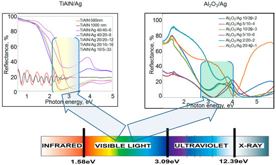 Reflection spectra of multilayer TiAlN/Ag and Al2O3/Ag nanocomposites with various architectures given on inserts.