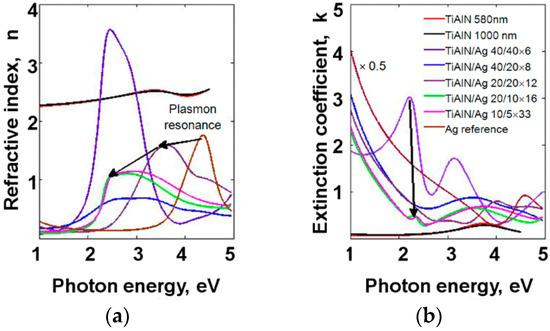 The reflectance level near ω0 is decreased significantly, and the transmittance bandwidth is expanded with by thinning the individual layers and increasing their number. We can see it clearly comparing reflectance curves for 40/40 × 06, 20/40 × 06 and 5/10 × 33 coatings, where the reflectance goes down to 30%, 15%, and 1.0%, correspondingly. Increasing of the layers number in the coatings with thin (≤10.0 nm) layers shifts the transmittance band to long waves with a smaller reflectance. Therefore the coating 5/10 × 33 adsorbs light with λ < 540 nm (2.3 eV) with an efficiency of more than 90%. This coating filters photons with λ > 540 nm. The key property of these coatings is an adsorption bandwidth with low reflection coefficients. Comparing the spectral data for the coatings with different layers thicknesses but approximately the same total thickness h (ML 20/20 × 12, h = 480 nm; ML 10/10 × 24, h = 480nm; and ML 05/10 × 33, h = 495 nm) we see that the adsorption band near ω0 is widening with Ag layers thinning. This regularity is also observed when comparing the width of the plasmon resonance zones in these coatings. One can see a growing plasmon peak FWHM from 0.6, 0.8 eV up to 1.0 eV with the Ag layer thinning in the row 40.0, 20.0, and 5.0 nm. Adsorption of the light in Ag/TiAlN planar nanocomposites results from the excitation of plasmon oscillation in the silver layers as well as plasmon-polariton interactions on the “metal-dielectric” interfaces. The energy (or resonance frequency) and width of the selective adsorption range of the electromagnetic radiation are correlating with the energy band of the plasmon resonance in the planar metamaterial. According to Equations (1) and (6), this correlation is a complex one.