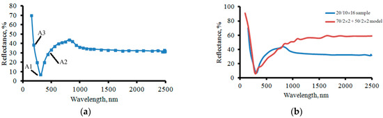 The reflectance spectrum of the multilayer plasmon MIM metamaterial as a function of Ag and Al2O3 layer thickness and number of bilayers was synthesised. Previously calculated optical constants for a bilayer Ag/Al2O3 coating and correlation dependences were used to model the reflection spectra of the MIM films with different architecture. This process was repeated several times. We have found that approximately five iterations of geometry realisations are necessary to optimise the experimentally observed reflection spectra of the Ag/Al2O3 MIM coating. An example of the simulated and experimental spectra is shown in Figure 8b. We have calculated the reflection spectra of the complex multilayer MIM coating using a mathematical model and compared it with experimental results.
