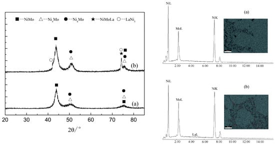 The XRD (X-ray diffraction, Philips PW3040/60, PANalytical B.V., Eindhoven, The Netherlands) diffraction patterns of the obtained coating are shown in Figure 1. The content of the atomic components in the coating measured, as shown in Table 1, by EDS is separately Ni 82.94%, Mo 17.06% for Ni–Mo solution system and Ni 74.05% and Mo 25.03%, La 0.92% for Ni–Mo–La solution system. The author’s previous research results had shown that with the existence content of La ions, the atomic percentages of Mo and La atoms gradually increase and the content of Ni atoms gradually decreases [4,5]. This can be defined as Ni–Mo–La ternary composite coating with the coexistence of Ni, Mo, and La three elements, which may be consistent with the three elements induced co-deposition [10,11,12,13,14,15]. The diffraction pattern of the composite shows a strong diffraction peak at near 2θ ≈ 43°, which belongs to the Ni–Mo composite from the coating (PDF Card-00-048-1745 Ni–Mo, A Powder Diffraction File (PDF) Card displays all of the scientific and bibliographic data available for a particular PDF entry and the composites structure). According to Scherrer’s formula [16],