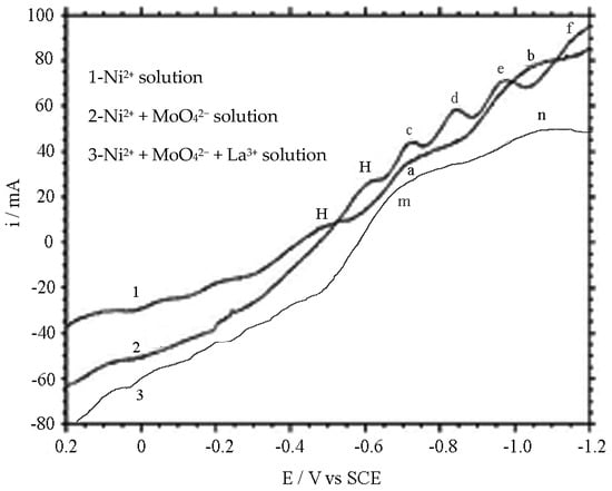 China is among the countries with relatively rich rare earth reserves. For a long time, China has always attached great importance to the development and utilization of rare earth elements and has made substantial returns in industrial and agricultural products. China has become the world’s largest producer, consumer, and exporter of rare earth products. Rare earth elements have an under-filled outer electron structure and their activity is high. A wide range of electron energy levels in the rare earth-containing composites is apt to be generated. The preparation conditions should be controlled strictly. Among the various types of rare earth materials, functional materials are mainly researched [1,2,3,4,5]. Energetic materials researches show that energetic materials containing lanthanum (La) and cerium (Ce) can absorb a large amount of hydrogen, so that they can be used as hydrogen storage materials [6,7,8], which will be helpful for the development and utilization of new energy sources. It is well known that when the rare earth elements interact with other metals, they are easy to become +3 valence ions, and combine with other atoms, but can show +1 valence ion or other transition valence state, and form different structures of the alloy materials. Since the reduction potential of lanthanum is more negative, the pure metal cannot be obtained by the electro-reduction method in the aqueous solution system. Therefore, the La-modified alloy has been extensively studied. Among the electrolytic cathode materials, rare earth La element generally is used to improve the structure and the chemical activity of the materials. The Ni–La alloy that was prepared by Liu et al. [3] through electrodeposition showed that La–H structure is formed in the alloy, which improved the hydrogen evolution catalytic activity of the alloy electrode. Based on the above, the Ni–Mo–La composite was prepared in the same way as in [4,5]. La–Ni–Mo catalysts for hydrogen production have been studied to verify its activity [1,2,3], effect of La, Mo content on the microstructures, and electrochemical performances of La–Mg(Al)–Ni–Mo hydrogen storage alloys was also studied to verify the rear earth elements activity on the formed composites [7,8,9]. In order to understand its catalytic activity, it is necessary to discuss the formation process and formation mechanism. So our group prepared the amorphous/nanocrystalline Ni–Mo–La composite by electrodeposition and studied the electrochemical activity of the composite [4,5]. The results showed that the Ni–Mo–La composite electrode has higher catalytic activity of hydrogen evolution than Ni–Mo alloy electrode, so that its over-potential of hydrogen evolution is lower. Electrochemical impedance spectroscopy (EIS) impedance experiments showed that the alloy has the characteristics of hydrogen storage material. The hydrogen evolution process is hydrogen absorption—hydrogen storage—desorption. In order to find out the precipitation and the formation mechanism of this kind of composite, the deposition process of the three-element was studied by polarography and cyclic voltammetry.