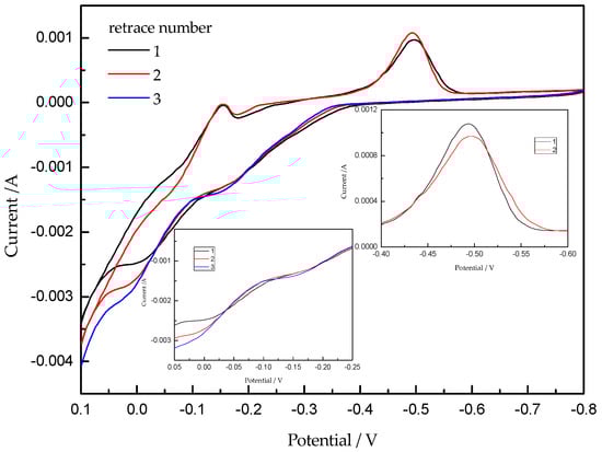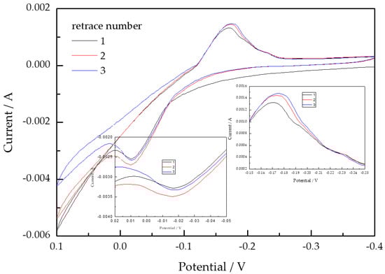 The cyclic voltammetry of the obtained Ni–Mo–La electrode as a cathode in 7 mol/L NaOH solution at 33 °C is shown in Figure 6. As can be seen from Figure 6, with the increase of the number of scanning, oxidation peak potential shifts positively. The reduction peak potential shift negatively, the peak potential difference increases. The reversibility of the electrochemical reaction decreases. The area of the oxidation peak and reduction peak of this composite is bigger. But, in the literatures [5,7,21,22,23] and other studies, it is shown that the oxidation peak area and electrochemical capacity are consistent. This shows that the composites can storage hydrogen to some extent. Oxidation peak potential is about −0.04–0.02 V. The reduction peak potential is about −0.152~−0.250 V. The redox potential difference is small, indicating that the reversible electrochemical hydrogen storage capacity of the composite is good. There is some hydrogen storage structure in the formed composite.