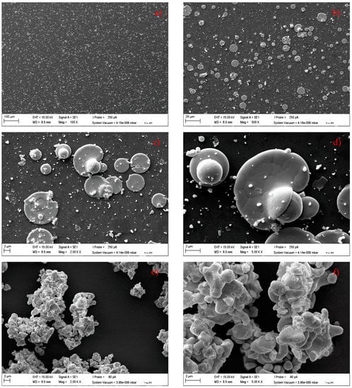SEM images of coated borosilicate glass with different magnification (a) 100×, (b) 500×, (c) 2000×, and (d) 5000×; Powder reference with different magnification (e) 2000× and (f) 5000×.