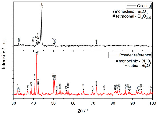 The cubic structure from the reference was not detected. The reflexes that could be verified from the monoclinic structure in the coating were at 32.6°, 41.25°, 42.25°, 50.1°, 50.39° and 71.64°. All others were not able to be detected. The tetragonal nonstoichiometric bismuth oxide phase could be generated, introducing oxygen into vacancies [24].