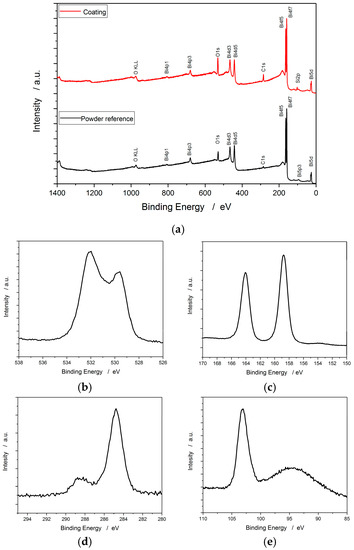 A direct shift in the Bi 4f7/2 peak between the reference and the coating with 158.6 and 158.7 eV was not apparent. Considering the assumption of the XRD data that Bi2O2.33 is represented in the coating, a split of Bi 4f into bismuth (II)-oxide and bismuth (III)-oxide could be adopted (Figure 5).