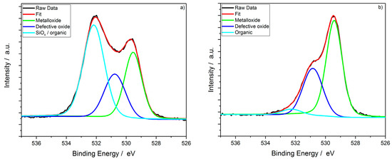 The O 1s peak shows the presence of three components and is pictured in Figure 4. The first structure corresponds to metallic oxygen (MO) at 529.5 eV with a FWHM of 1.3. The peak at 530.8 eV (FWHM 1.6) could be assigned to defective sites within the oxide crystal (DO) [29]. The peak at 532.2 eV was composed of organic compounds (org. C) (adventitious carbon [30]) and, in the case of the coating, silicon oxide [31] and organic compounds.