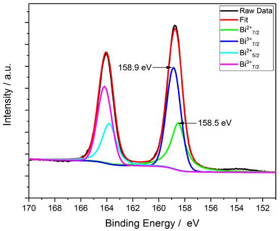 There are four main structures in the Bi 4f peak. The lower peak at 158.5 and 163.8 eV could be assigned to Bi2+ and the peak at 158.9 and 164.2 eV to Bi3+, which corresponds to Guan et al. [32]. This results in a proportion of 6.61 at.% and 9.98 at.% of Bi2+ and Bi3+.