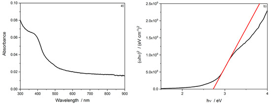 where Eg is the band gap, α the absorption coefficient, A is a constant, and hv is the photon energy. For the description of a direct or indirect band transition n = 1/2 or n = 2 [35]. The optical band gap can be determined via the extrapolation of the plots (αhv)2 or (αhv)1/2 vs. (hν), where α = 0 is set. This plot is shown in Figure 6b. Because no linear segment could be found in the plot (αhv)1/2 vs. (hν), it can be concluded that the deposited layer had a direct band gap [36] with Eg = 2.72 eV.