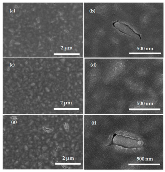 Figure 2 presents the top-view SEM images of SnO2 thin films deposited on compact TiO2-coated rough FTO for 30 s at 2000 rpm (Figure 2a,b), 3000 rpm (Figure 2c,d), and 4000 rpm (Figure 2e,f), respectively. As shown in Figure 2a,b, the cracks on the surface of the TiO2/SnO2 thin film were obviously filled with SnO2 crystal grains. Due to the rotational speed being too low, a thick SnO2 thin film formed. Thus, many cracks appeared on the surface of the SnO2 thin film. Jiang et al. demonstrated a dense, pinhole-free film formed by spin coating SnO2 nanoparticles solution onto glass/Indium-Tin Oxide (ITO) substrate at 3000 rpm [23]. However, in our experiment, as shown in Figure 2c,d, modified TiO2/SnO2 thin film without visible cracks through solution spin-coating SnO2 on compact TiO2-coated rough FTO at 3000 rpm formed, and is flat, uniform, and dense, which indicates the TiO2/SnO2 complementary composite hole blocking layer is able to fully cover the rough surface of the FTO electrode. Choi et al. demonstrated the TiO2 film was so too thin that pinholes were observed in the TiO2 layer, and electrons in the FTO layer easily recombined with holes due to the lack of hole blocking [15]. However, in our experiment, as the rotating speed increased to 4000 rpm, the bare FTO was exposed from a few large cracks in Figure 2e,f, which indicated that the thickness of the functional layer of SnO2 was thinner due to the excessive spin-coating speed, and coverage of FTO/TiO2 based substrate is incomplete. This result suggests that the direct contact between bare FTO and the perovskite light-absorber layer can cause the recombination of holes and electrons, leading to the degradation of device performance. It is consistent with the results obtained with summary of photovoltaic parameters with the J–V characteristics from reverse scan of the PSC devices based on TiO2/SnO2 complementary composite hole blocking layer.