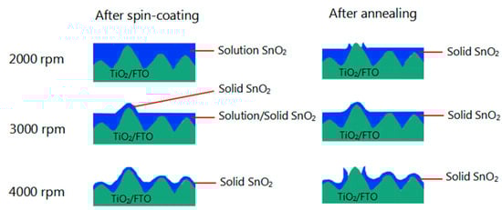 However, the reasons for formation of cracks are different under high speed (4000 rpm) and low speed (2000 rpm), presented in detail in Figure 3. Figure 3 presents schematics for formation process of SnO2 thin films at different rotational speed. Compared with situations of other rotational speed, the SnO2 thin film from 2000 rpm was thicker, and the total amount of solution in the film was more. The solvent volatilization rate is lower during the spin coating process of 30 s, so that the solution film of SnO2 was formed. During the annealing process of the solution film at 150 °C for 30 min, the solvent evaporated and the solution film contracted in the thickness direction, resulting in the exposure of the sharp peak of substrate, thus forming the cracks, as shown as Figure 3, corresponding to the SEM images (Figure 2a,b).