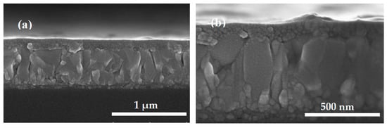Figure 4 presents the cross-sectional SEM images of the TiO2/SnO2 complementary composite hole blocking layer with SnO2 spin-coated on compact TiO2-coated FTO at 3000 rpm, which indicated the formation of modified TiO2/SnO2 film without visible breakages. As shown in Figure 4a, the entire film of TiO2/SnO2 complementary composite hole blocking layer was uniform in thickness and completely covered. Compared with single-layer TiO2 hole blocking layer thin film, the SnO2 thin film spin-coated on compact TiO2-coated rough FTO exhibited a flatter surface. Notably, as shown in Figure 4b, the TiO2/SnO2 complementary composite hole blocking layer also has good coverage at the protrusions of the underlying substrate and no breakage or large bulging in the protrusions could be observed. This is consistent with the observation from top-view SEM images of SnO2 films deposited on compact TiO2-coated rough FTO at 3000 rpm (Figure 2c,d).