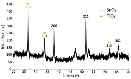 XRD data of the SnO2 thin film deposited on FTO/TiO2 substrate were collected in Figure 6. Each of the marked peak positions in the figure (Figure 6) corresponded to the (110), (101), (200), (211), (310), (301) crystal planes of the SnO2 crystal, which was in consistent with the results of the previous report [23] about XRD pattern of the SnO2 material, indicating SnO2 thin film composite counter electrodes had been successfully deposited on the FTO/TiO2 substrate.
