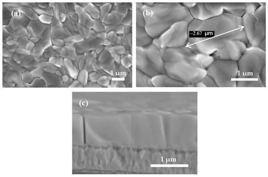 Figure 7 presents top-view SEM images (Figure 7a,b) and cross-sectional SEM image (Figure 7c) of perovskite thin films deposited on TiO2/SnO2 of solution spin-coating SnO2 on compact TiO2-coated rough FTO at 3000 rpm, respectively. From Figure 7a,b, it can be seen that the entire perovskite film was high-quality and quite uniform free of cracks. However, high-quality perovskite film is essential for the performance of planar PSCs, as it can avoid the direct contact of hole blocking layer and electron blocking layer [20]. It is worth noting that the individual grain size of perovskite crystals was especially large, and the largest grain size reached a rare 2.67 μm. Furthermore, due to the passivation of the doping, the grain boundary was too smooth, which reduced defects of grain boundaries in the perovskite film to a great extent. From the cross-sectional SEM image (Figure 7c), it can be found that the entire perovskite film was composed of single layer of large grains and uniformly dense, which is coincident with the morphology of the film on the top-view SEM images (Figure 7a,b).