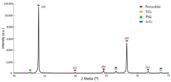 Figure 8 displays the XRD pattern of the perovskite thin film deposited on FTO/TiO2/SnO2 substrate in the case of spin-coating SnO2 at 3000 rpm. Obviously, the XRD pattern presents strong and sharp (101) and (200) diffraction peaks at 14.02° and 28.32°, demonstrating the good crystallinity of perovskite film, which is consistent with the SEM results (Figure 7) of the large-grain-size perovskite film. The perovskite grains of good crystallinity effectively enhance the efficiency of injection of photo-carriers of the perovskite light-absorber layer into the hole blocking layer and electron blocking layer, thereby further improving the overall performance of the PSC device.