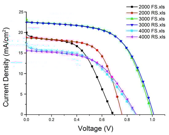 Figure 10 shows the J–V curves from reverse scan (RS) and forward scan (FS) for the PSC devices based on TiO2/SnO2 complementary composite hole blocking layer under different SnO2 spin-coating speeds, measured under simulated sunlight with intensity of 100 mW cm−2 (AM 1.5 G). Obviously, when the SnO2 spin-coating speed was 3000 rpm, the RS and FS curves of the device basically coincided and the hysteresis phenomenon basically disappeared, which matches the thin film morphology seen from the top-view SEM images (Figure 7a,b). When the SnO2 spin-coating speeds were 2000 and 4000 rpm, a SnO2 functional layer that was wither too thick or too thin could not match well with the TiO2 compact layer to form modified TiO2/SnO2 complementary composite hole blocking layer. This led directly to a drop in the optoelectronic performance of the device. The presence of cracks also caused serious electrical current leakage existing inside the device, resulting the PSC devices under these two processes having different degrees of hysteresis.