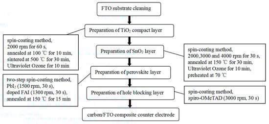 The surface treatment of the FTO for complete coverage before deposition of any film which affect severely the film deposition and properties. Malviya et al. demonstrated that rigorous cleaning process yielded clean FTO surface, and rigorous cleaning of the substrates prior to the hematite deposition was crucial for achieving highly reproducible results [27]. In order to ensure the quality of the subsequent film deposition, we thoroughly cleaned the FTO glass substrate before proceeding to the next step. FTO substrate was firstly wiped using a mixed solution of detergent and deionized water. The resultant FTO substrates were ultrasonically cleaned with glass water (deionized water: acetone: 2-propanol = 1:1:1) and ethanol for 20 min, separately. The FTO glasses were dried with dryer for 30 min and then cleaned with ultraviolet ozone for 10 min. Compact TiO2 layer was deposited on the cleaned FTO substrate by spin-coating an acidic titanium dioxide solution at 2000 rpm for 60 s. The substrate was annealed on a hotplate at 100 °C for 10 min, and then sintered in muffle furnace at 500 °C for 30 min. For TiO2/SnO2 complementary composite hole blocking layer based devices, due to the hydrophobicity of the TiO2 thin film layer and the complete aqueous solution of the SnO2 precursor solution, the FTO/TiO2 substrates were firstly cleaned by ultraviolet ozone for 10 min in order to form a hydrophilic group on the surface of the film. Then the SnO2 functional layer was prepared by spin-coating 3 wt % SnO2 precursor solution on the compact TiO2-coated FTO substrate for 30 s at 2000, 3000, and 4000 rpm, respectively [23]. Subsequently, the FTO/TiO2/SnO2 based substrates were dried on a hotplate at 150 °C for 30 min, and then cleaned by ultraviolet ozone for 10 min again to improve its hydrophilicity.