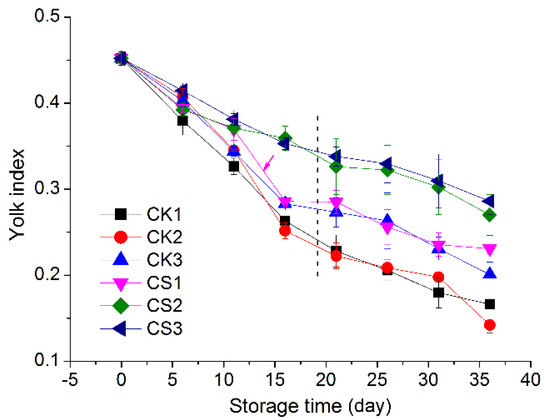The decreased values of yolk index with storage time was a result of liquefaction and flattening of yolk, which was attributed to the constant permeation of water from albumen to yolk through vitelline membrane driven by the osmotic pressure [11]. The osmotic pressure between albumen and yolk was associated to the albumen viscosity, which was reduced by the breakage of ovomucin-lyzyme complex. Therefore, when chitosan coating reduced the loss of CO2 and water vapor and slowed down the structural changes in albumen, the increase in osmotic pressure between albumen and yolk would be slowed down resulting in improved yolk quality.