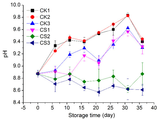 Since the albumen of fresh-laid eggs are saturated with CO2, the evacuation of CO2 through eggshells led to an increase in the albumen pH with increasing storage time. As given in Figure 2, the albumen pH of CK1 and CK2 increased to as high as 9.8 after storage for 31 days. The followed decrease at day 36 might be attributed to the breakdown of proteins in the albumen to fat and peptone. The albumen pH values of CK3 and CS1 presented similar changes, but were always lower than those of CK1 and CK2 at the same time. The pH value of CS1 also showed a sharp increase from day 11 to day 16. However, the albumen pH value of CS2 and CS3 was stabilized between 8.5 and 8.9 during the whole storage. Similar results have also been observed in eggs coated by proteins [11] and edible oils [31]. The stable albumen pH of CS2 and CS3 should be a result of the effective reductions of CO2 loss in albumen, which further confirmed the considerably improved barrier properties of eggshells by chitosan coating two or three times.