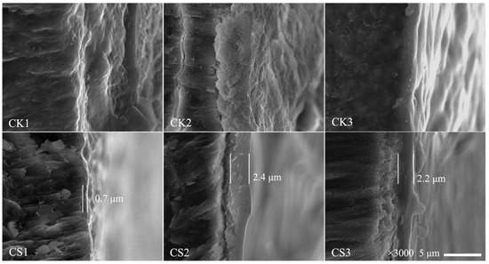 Therefore, the micrographs of the eggshell cross-sections were examined and given in Figure 4, chitosan coating layers with different thickness were found on the outside of the eggshells of CS1, CS2, and CS3. The chitosan coating layer on the eggshell of CS1 showed a thickness of approximately 0.7 μm, which was too thin to homogeneously cover the whole eggshell and to act as a dense and effective barrier layer. This might be the reason that CS1 showed comparable performance with that of CK3 during storage. The thicknesses of the coating layers of CS2 and CS3 were close to each other, and were larger than 2 μm. Although a dense eggshell surface was obtained by merely acetic acid treatment of eggs, eggshells of CS2 or CS3 coated by chitosan two or three times, which formed a dense polymer layer with a thickness of several micrometers on the outside of eggshells, provided more effective barriers compared to that of CK3.