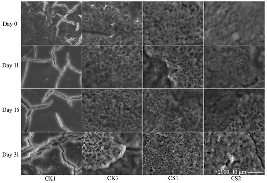 Another thing that needed to be figure out is whether there are structural changes on the coating layers with increasing storage time, when they are constantly influenced by the environmental conditions and the gas transfer between eggs and surroundings. If the dense structure of coating layers was destructed during storage, the barrier properties of eggshells would certainly be compromised thus affecting the physical and chemical changes of eggs. Therefore, micrographs of eggshell surfaces were taken at different times during storage with a magnification of 2000× as given in Figure 5. It was clearly observed that the cracks on the eggshells of CK1 were gradually widened with increasing storage time, which indicated the weakened protection functions of the eggshell with time. For CK3, a stable structure with little change on the surface morphologies was observed on the eggshells treated by acetic acid. For CS1 and CS2, their eggshell surfaces were somewhat blurred at day 0 because of the soft texture of chitosan coating. As the storage time increased, some parts of the surfaces became clear with some micro-pits on it, which were similar to the morphology of CK3. Therefore, it might reveal that the dense structure of chitosan coating was gradually destructed during storage. Furthermore, this phenomenon was firstly observed for CS1 at day 11, while for CS2 at day 16 as observed in Figure 5. Since the coating layer on the eggshell of CS1 was thinner than that of CS2, it was reasonable that the coating on CS1 was more vulnerable to damages.