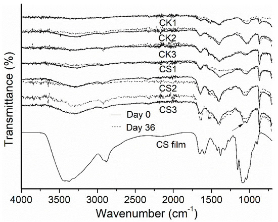 Fourier Transform Infrared (FTIR) spectra of CS film and eggshell surfaces at day 0 (solid line) and day 36 (dashed line).