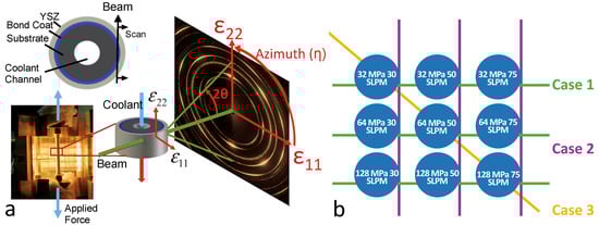 To understand both the effect of the loading condition, and to isolate their influence on the strain of the employed coating layers, in-situ measurements are required. Time dependent behaviors for multi-layer coating systems can be observed with the application of high energy X-ray diffraction from a synchrotron source in in-situ testing [24,25,26,27,28]. These high available energies and flux result in short collection times and high spatial resolution for simultaneous non-destructive analysis of multiple constituents and layers. This has been utilized to quantify the effect for a multi-variable assessment and to elucidate the conditions’ influence on the failure mechanisms that plague TBCs.
