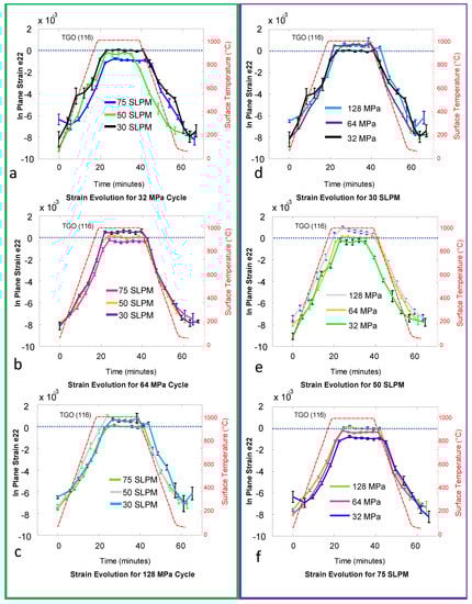 TGO e22 strain response over thermal cycle for constant mechanical load with varying flow (a–c); and replotted to show constant flow with varying mechanical loading (d–f).