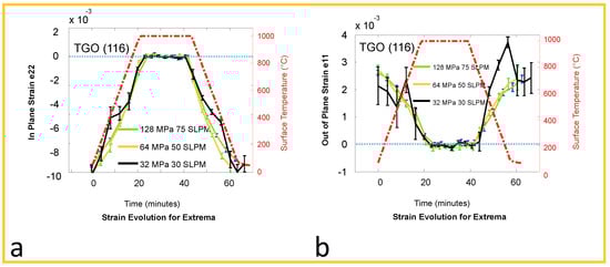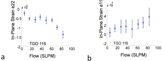 In an effort to more completely understand the individual variables’ influences, additional experiments were designed as shown in Figure A1b. While at a constant surface temperature of 1000 °C, internal cooling flow was gradually increased from 0 SLPM to 85 SLPM. No mechanical load was applied in these experiments. The resulting in plane and out of plane (e22 and e11) TGO strain results are plotted in Figure 4a,b, and the influence of increasing coolant flow can be quantified. The trends follow an expected non-linear response, which results from the heat transfer coefficient being non-linear for transitioning internal pipe flow from laminar to turbulent [31,32]. This is seen to level out the resulting strain response between 40 and 60 SLPM. For the e22 response, the maximum flow is observed to result in −1.5 × 10−3 (compressive) strain. Conversely, for e11 response, the maximum flow increases the strain to 4 × 10−4 (tensile).