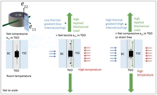 The breakthrough of establishing the competing influences of applied loads and thermal gradients on the internal strains lies in identifying critical cycle scenarios that can lead to tensile strains within the TGO which have a negative impact on durability. This work offers the capacity to use the measurement results to establish design strategies for internal cooling that would prevent the generation of tensile strains within the TGO, potentially avoiding specific damage mechanisms.