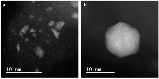 Scanning transmission electron microscope (STEM) high-angle annular dark field images of gold nanoparticles: (a) Irregular shape; (b) Polyhedral shape (truncated icosahedron).