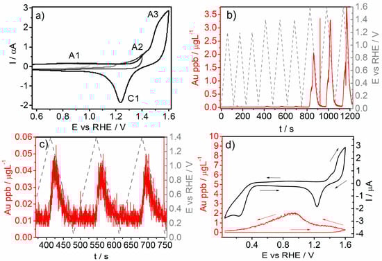 (a) Cyclovoltammetric (20 mV·s−1) response of Au polycrystalline disc by gradually increasing the upper potential limit for 200 mV from 1 V to 1.6 VRHE in 0.05 M H2SO4 in a conventional three-electrode cell; (b,c) Electrochemical flow cell coupled to inductively coupled plasma mass spectrometry (EFC-ICP-MS) measurements of Au dissolution from Au polycrystalline disc during potentiodynamic cycles (20 mV·s−1, 0.05–1.4 or 1.6 VRHE) in 0.05 M H2SO4; (d) Simultaneous presentation of Au dissolution profile and current signal during the potentiodynamic cycle (20 mV·s−1, 0.05–1.6 VRHE).