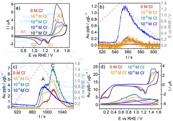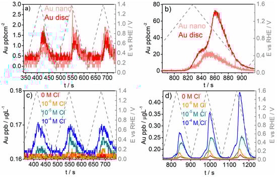 EFC-ICP-MS measurements of Au dissolution from Au polycrystalline disk in the absence (a,b) and presence of chlorides (c,d) during potentiodynamic cycles (20 mV·s−1, 0.05–1.4 or 1.6 VRHE); (d) Simultaneous presentation of Au dissolution profile and current signal during potentiodynamic cycling (20 mV·s−1, 0.05–1.6 VRHE).
