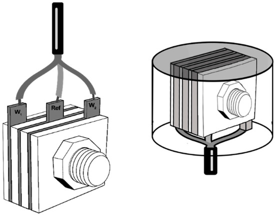 An electrochemical monitor (ACM) was assembled to assess the performance of the coatings in atmospheric conditions. The design consists of an arrangement of three identical electrodes: two electrodes as working electrodes (W1, W2) and a central electrode functions as a “pseudo” reference electrode (Ref). The metal plates were cut to 2.5 × 2.5 cm2 with a thickness of 0.4 cm. To avoid the short-circuit of the metal electrodes, a 0.1 mm thick Teflon plate was placed between each of them, as shown in Figure 1.